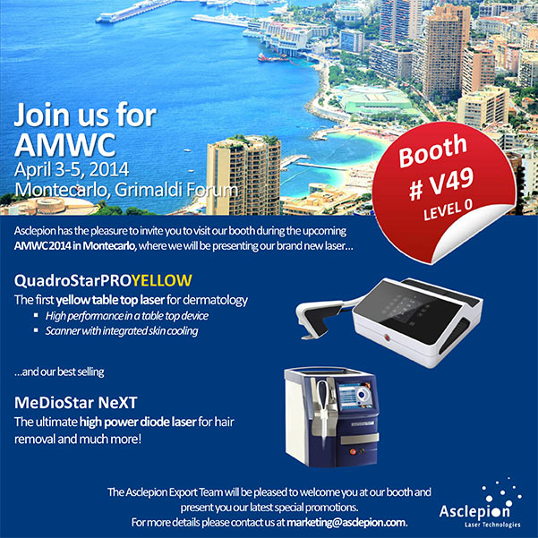 Компания Asclepion приглашает Вас посетить 12-й Международный Конгресс по Антивозрастной Медицине (AMWC 2014) который пройдет в Монако с 3 по 5 апреля 2014 года. Лазеры Asclepion будут представлены на Стенде № 49.