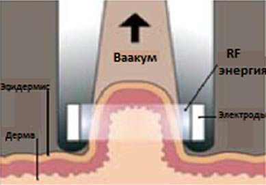 Під час процедури, насадка RF за допомогою вакууму всмоктує шкіру, яка у вигляді складки міститься між двома електродами і охолоджується. Імпульс радіохвиль максимально вибірково нагріває тільки лікувальну ділянку шкіри, що знаходиться між двома електродами, в результаті чого відбувається глибокий прогрів дерми. Колагенові та еластинові волокна оновлюються, шкіра підтягується, покращується її структура відразу після першої процедури з подальшою динамікою протягом 2-4 місяців.