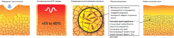 Контрольований нагрівання глибоких шарів шкіри, призводить до скорочення колагенових ниток і запускає процес їх регенерації, а також синтез молодого колагену. Реструктурований колаген скорочується, шкіра виглядає пружнішою, а зморшки стають менш помітними.